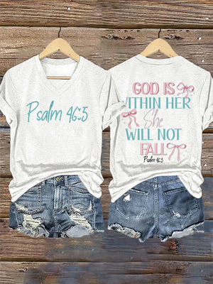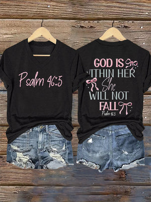 V-Neck Retro God Is Within Her She Will Not Fall Psalms 46:5 Print T-Shirt