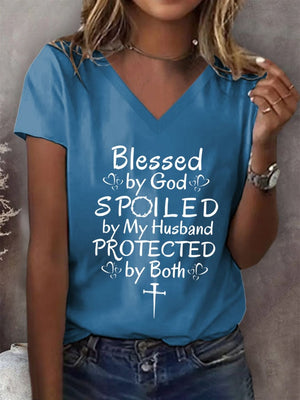 Women's Blessed by God Spoiled by my Husband Protected by Both Print T-Shirt