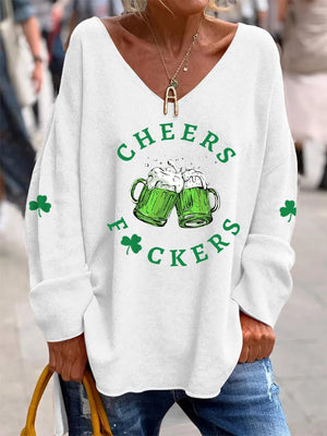 Women's Funny St. Patrick's Day Cheers Green Beer Shamrock Print Casual V-Neck Top